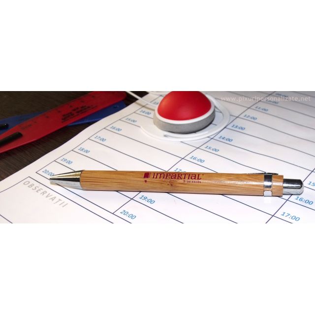 Pix din bambus cu varful, butonul si clipsul metalice. Mina pixului este albastra.