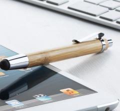 Pix "Tashania" din bambus cu insertii cromate si stylus pentru touch screen. Pixul are pasta de culoare albastra.