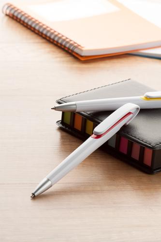 Pixuri personalizate din plastic alb cu insertii elegante colorate. Pixuri cu clips lat si generos ce reprezinta o suprafata mare de personalizare.